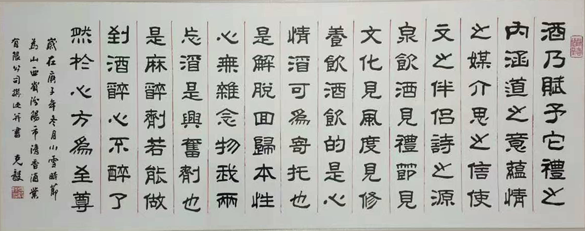 汾陽(yáng)市清香酒業(yè)有限公司座落在中華名酒第一村---杏花村申明亭路9號(hào)。《汾酒曲》中記載,申明亭畔新淘井,水重依稀亞蟹黃 ,注解說(shuō):申明亭井水絕佳,以之釀酒,斤兩獨(dú)重。明末愛國(guó)詩(shī)人、書法家和醫(yī)學(xué)家傅山先生,曾為申明亭古井親筆題寫了得造花香四個(gè)大字,說(shuō)明杏花井泉得天獨(dú)厚,釀出的美酒如同花香沁人心脾。 汾陽(yáng)市清香酒業(yè)有限公司出品的清香型高端白酒用的是優(yōu)質(zhì)高粱、大麥和豌豆等上等原料和申明亭地下礦泉水,再加上杏花村土壤和空氣中獨(dú)有的菌群,在杏花村釀酒匠人的傳統(tǒng)工藝下精心釀造:清蒸二次清,固態(tài)地缸分離發(fā)酵,清字當(dāng)頭,一清到底,釀出的酒:酒液晶亮、清香幽雅、醇凈柔和、回甜爽口、飲后余香,在國(guó)內(nèi)外享有盛譽(yù)。